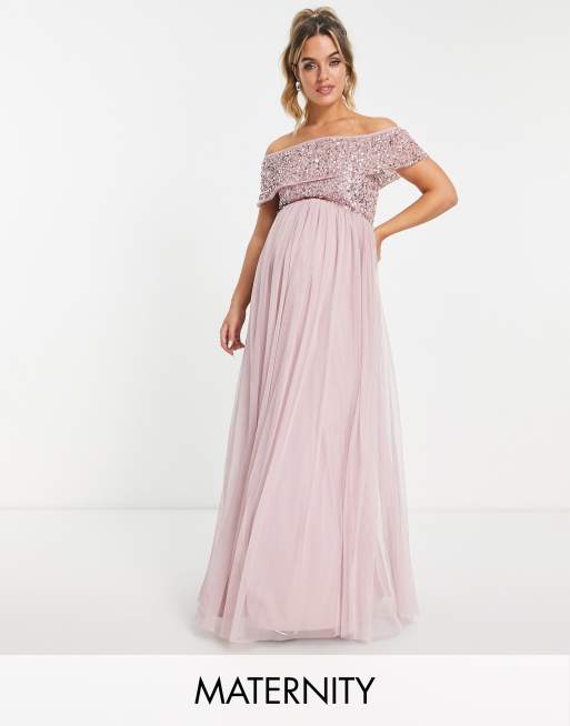 Vestido de dama de honor largo rosa escarcha con escote Bardot y abalorios de Beauut Maternity