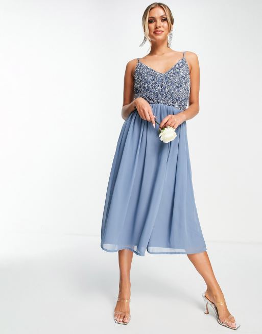 Vestido de dama de honor midi azul adornado con falda de tul de Beauut