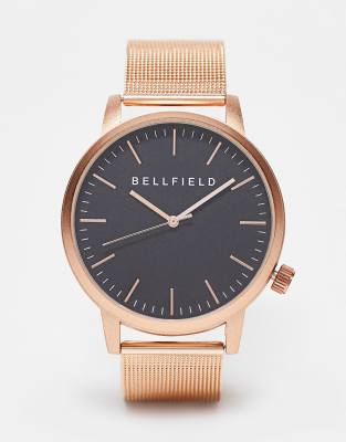 Reloj de pulsera dorado rosa con esfera negra y correa de malla de Bellfield