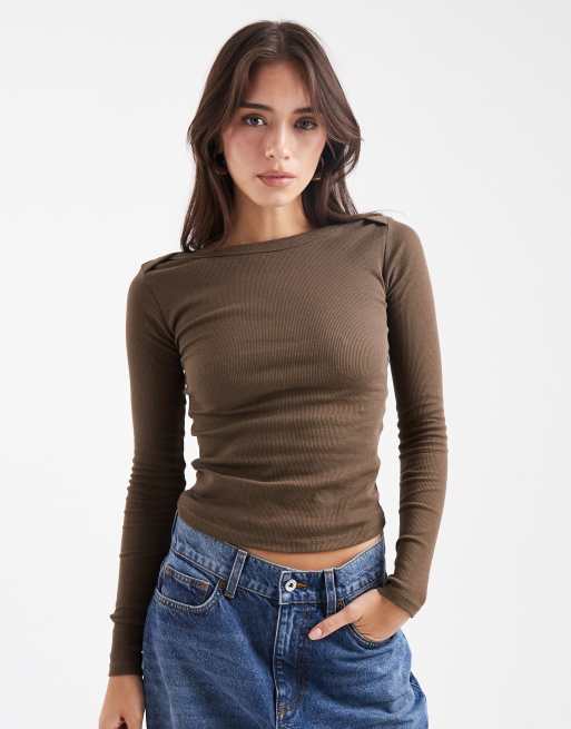 Top marrón de manga larga con cuello barco de punto liso de Brave Soul