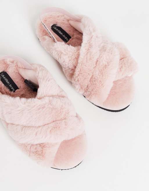 Pantuflas rosas con banda del logo de piel sintética de Calvin Klein
