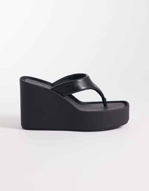 Sandalias negras de dedo con cuña de cuero de Calvin Klein Jeans