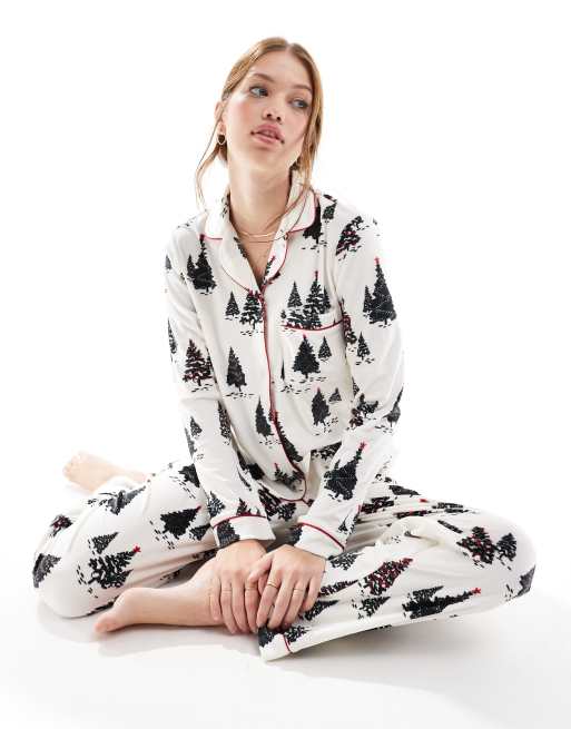 Pijama blanco nieve de top y pantalones con estampado de árboles de Navidad de velour de Chelsea Peers