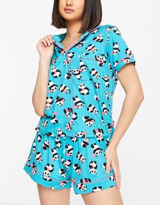 Pijama corto azul abotonado con estampado de pandas y corazones de Chelsea Peers