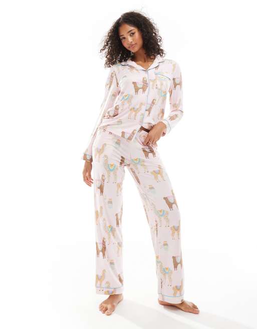 Pijama rosa de pantalones y top de manga larga con cuello de solapas y estampado de alpacas de poliéster de Chelsea Peers