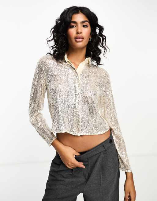 Camisa corta plateada holgada de lentejuelas de Closet London