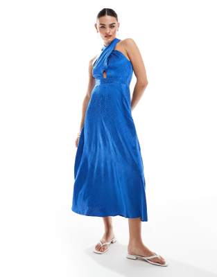 Vestido midi azul cobalto con detalle retorcido en la parte delantera de satén de Closet London