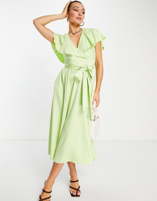 Vestido midi verde lima con mangas acampanadas y cintura fruncida de Closet London