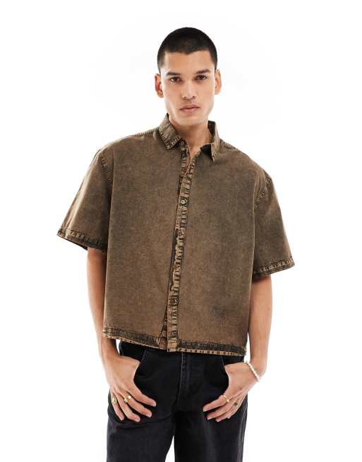 Camisa caqui lavado de corte cuadrado y manga corta con cinta en contraste y bordados de COLLUSION