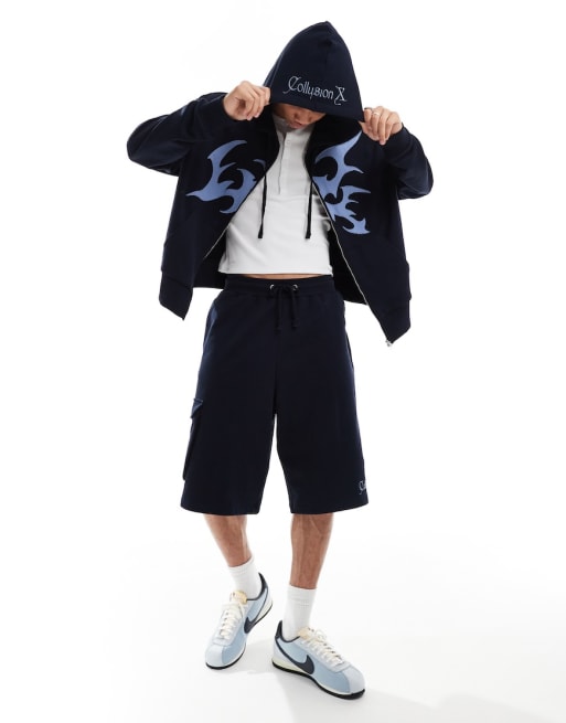 Conjunto azul marino bordado de sudadera con capucha y cremallera y pantalones cortos de COLLUSION