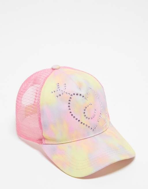 Gorra de camionero rosa con efecto tie dye y detalle de strass de COLLUSION