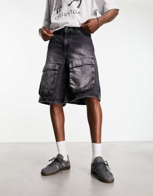 Pantalones cortos vaqueros alargados con lavado negro y bolsillos cargo de COLLUSION