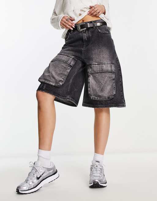 Pantalones cortos vaqueros largos y holgados con bolsillos cargo y lavado negro para festivales de COLLUSION