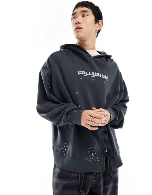Sudadera negro lavado con capucha, acabado desgastado y detalle de cordones de COLLUSION