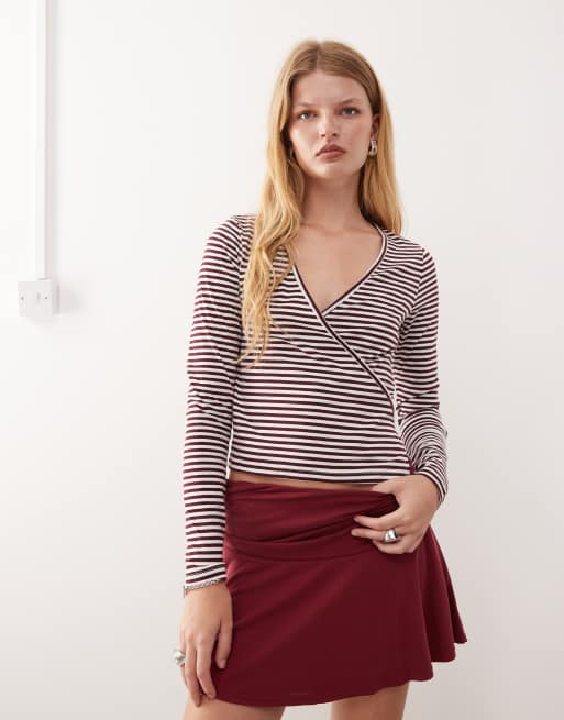 Top a rayas bermellón cruzado de manga larga con cuello de pico de COLLUSION
