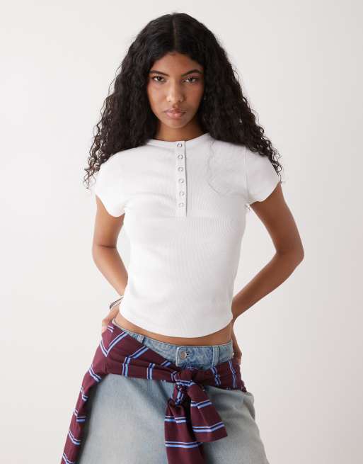 Top blanco de manga corta con cuello panadero de canalé de COLLUSION