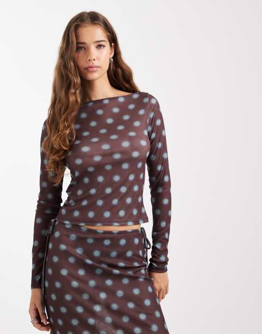 Top marrón con cuello recto y estampado de lunares azules difuminados de COLLUSION (parte de un conjunto)