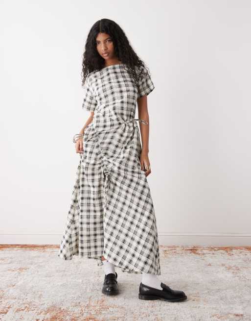 Vestido largo a cuadros beis con detalles fruncidos de COLLUSION