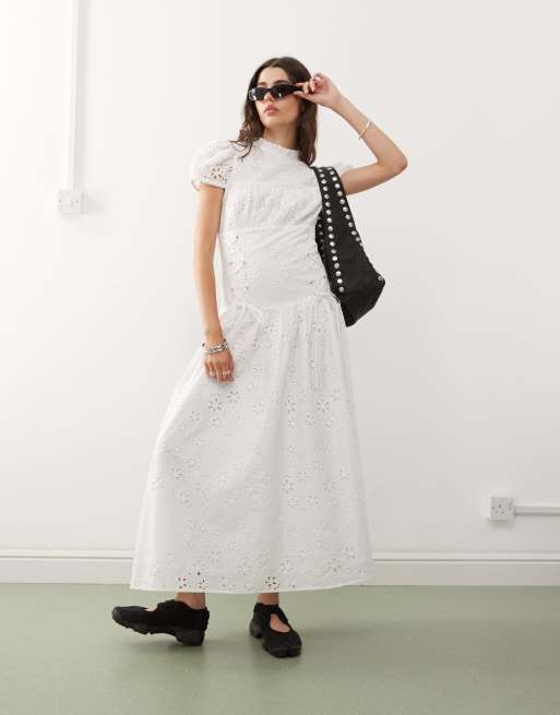 Vestido semilargo blanco con bordado inglés y cordones laterales de COLLUSION