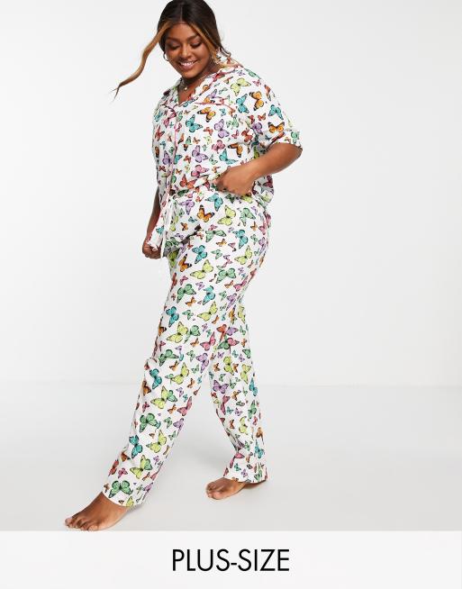 Pijama de camisa de manga corta, pantalones y antifaz con estampado luminoso de mariposas de Daisy Street Plus