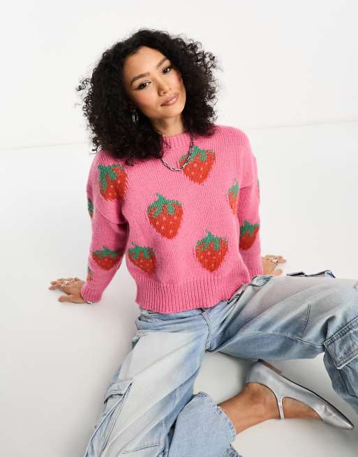 Jersey rosa con patrón de fresas de corte cuadrado de punto grueso de Daisy Street
