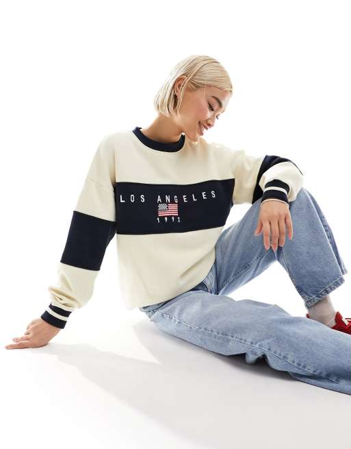 Sudadera color piedra y azul marino con estampado "LA" y diseño de paneles a rayas de Daisy Street