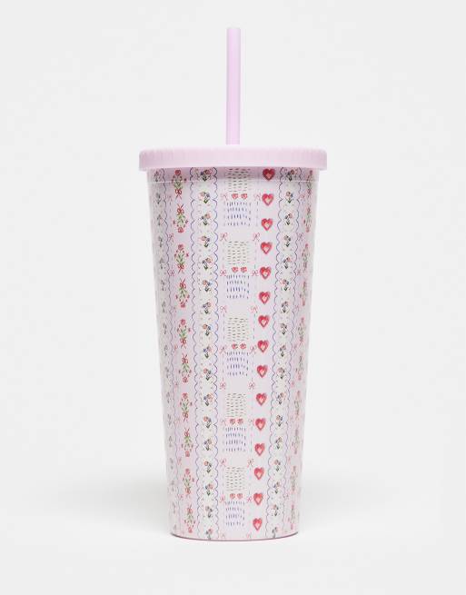 Taza de viaje rosa con estampado estilo tapiz y pajita reutilizable de Daisy Street