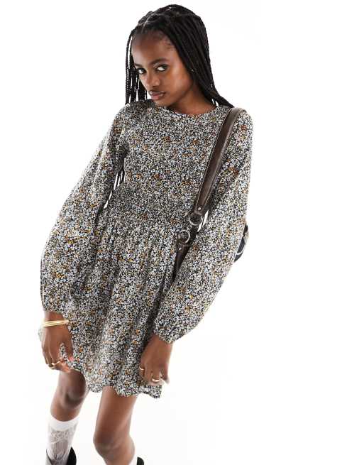 Vestido corto amplio fruncido de manga larga con estampado de florecitas primaverales de Daisy Street
