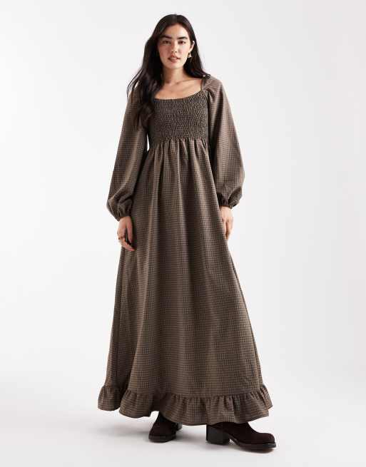 Vestido largo marrón azulado a cuadros fruncido de manga larga de Daisy Street