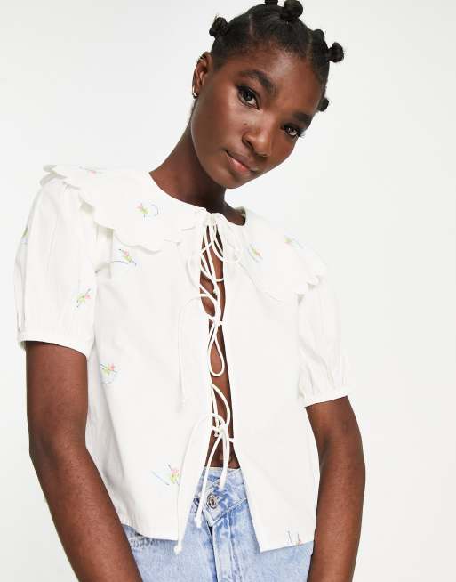Blusa blanca bordada con bordes festoneados y detalle de lazadas de Damson Madder