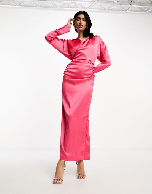 Vestido camisero largo rosa cruzado de satén de DASKA