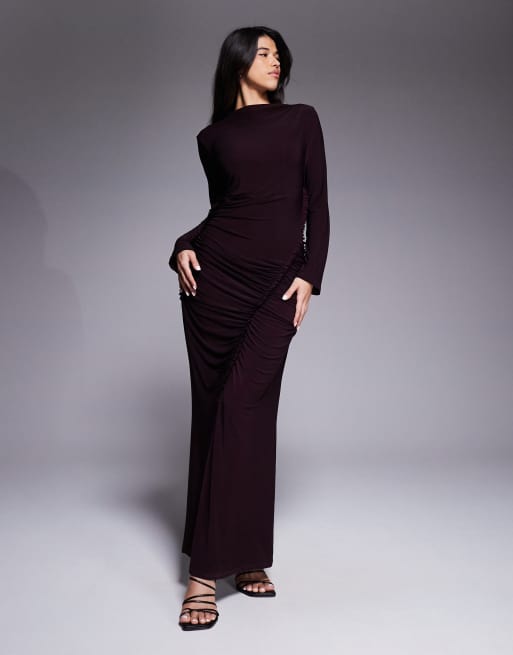 Vestido largo color vino ceñido fruncido con detalle de costura con volantes de Daska