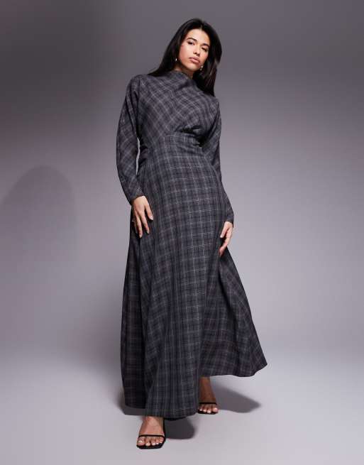 Vestido largo gris a cuadros escoceses con mangas murciélago, cuello alto y cintura fruncida de Daska