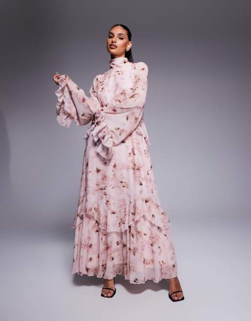 Vestido largo rosa con cuello alto, estampado floral y volantes escalonados de Daska