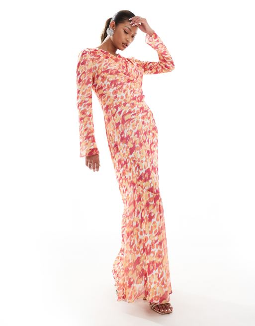 Vestido largo rosa con cuello desbocado y estampado animal de chifón de Daska