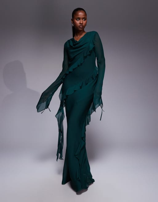 Vestido largo verde esmeralda con volantes de chifón de Daska