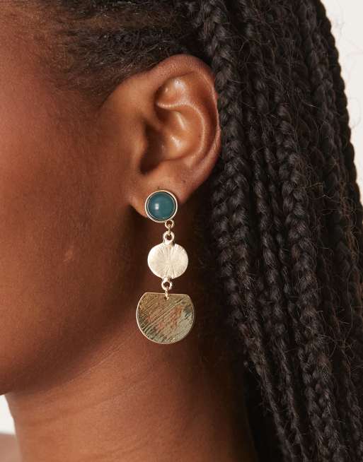 Pendientes largos dorados con diseño de disco y detalle de resina de DesignB London