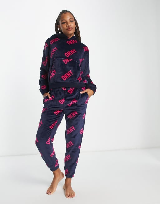 Conjunto azul marino de joggers y sudadera con capucha con estampado del logo de chenilla suave de DKNY