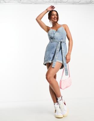 Mono vaquero corto azul claro con parte delantera cruzada y cinturón de DTT
