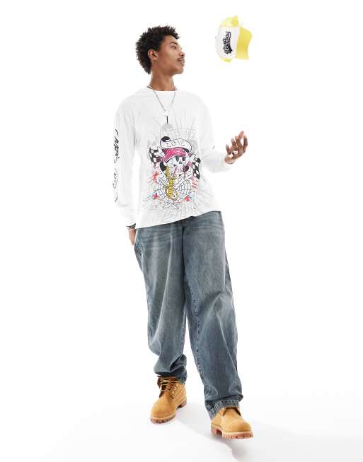 Camiseta blanca de manga larga y estilo skater con estampados gráficos variados de Ed Hardy