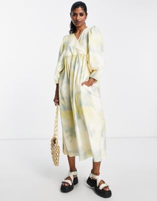 Vestido amarillo amplio y cruzado con mangas globo y efecto tie dye de algodón de EDITED