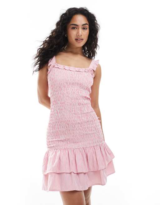 Vestido playero corto rosa y blanco a rayas fruncido exclusivo de Esmee