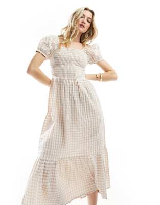 Vestido playero largo beis y blanco a cuadros vichy con diseño fruncido y mangas abullonadas de Esmée