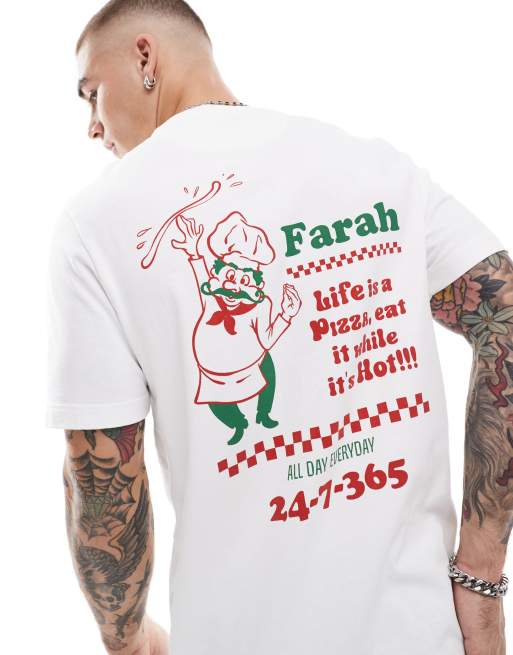 Camiseta blanca con estampado trasero y delantero de pizzería Powis de Farah