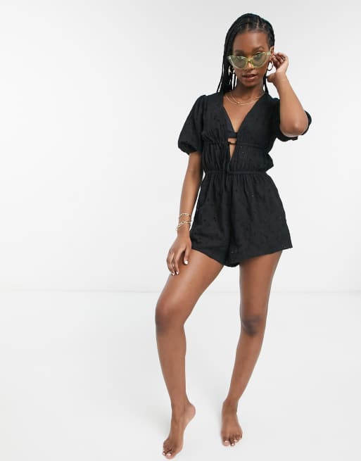 Mono corto de playa en negro con bordado inglés de Fashion Union