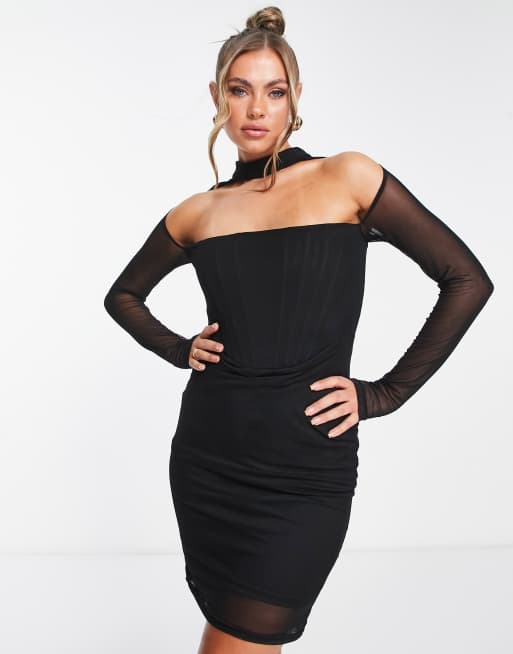 Vestido midi negro de manga larga con detalle de corsé de malla de Femme Luxe