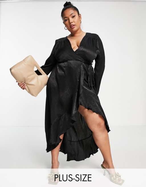 Vestido largo negro cruzado de manga larga de satén de Flounce London Plus