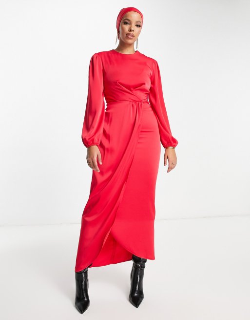 Vestido largo rojo cruzado en la parte delantera de satén de Flounce London