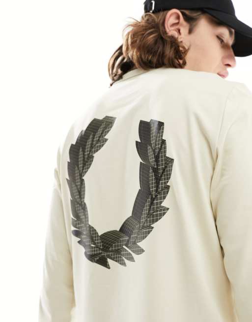 Camiseta color avena de manga larga con estampado gráfico tridimensional en la espalda de Fred Perry