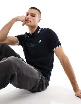 Polo con logo y dos rayas en azul marino/blanco de Fred Perry